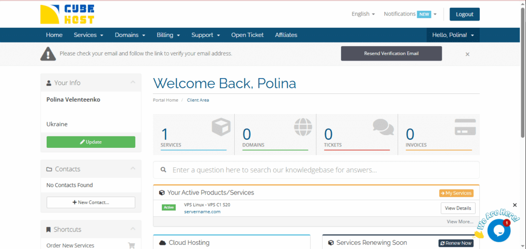 Після входу в систему користувач потрапляє в «Особистий кабінет» — головну сторінку для управління послугами Cube-Host.
