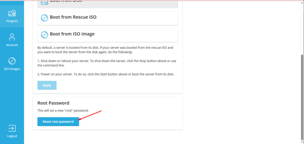 Прокрутіть вниз до розділу «Пароль root» і натисніть кнопку «Скинути пароль root».